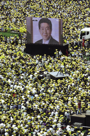 首尔广场聚集了至少18万悼念民众,许多人手臂和脖子上系着黄色丝带,手持印有卢武铉头像的黄色纸牌,空中不时飘过黄色气球,就像黄色的海洋。