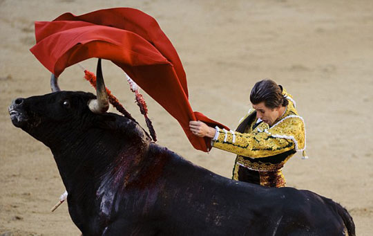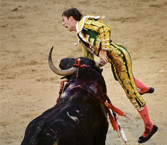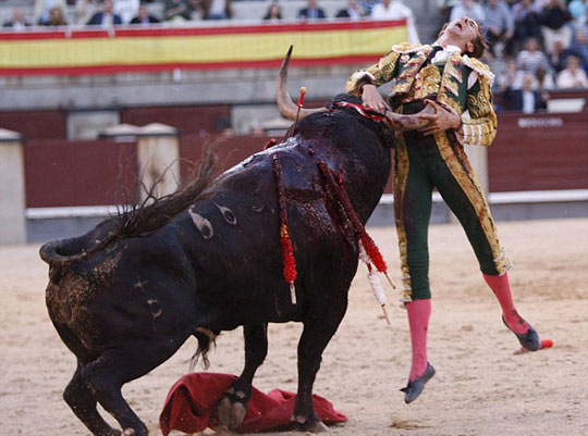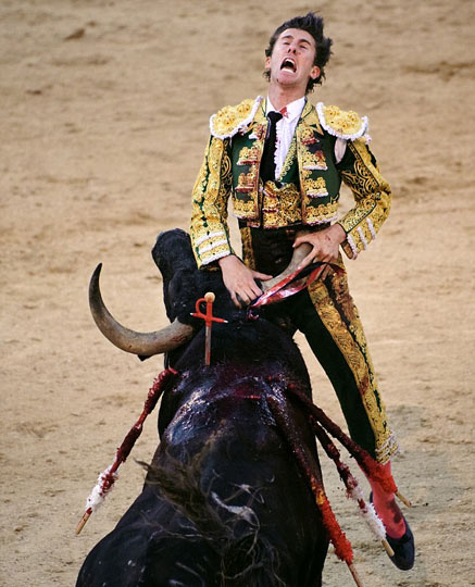 斗牛士表情痛苦。