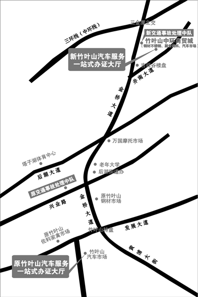 本报讯(记者 肖娟 通讯员 陈文春)原在竹叶山汽车市场内的江岸大队车管业务办证大厅,8日将整体搬迁至金桥大道特一号竹叶山中环商贸城内(金桥大道井南路口右转)。
