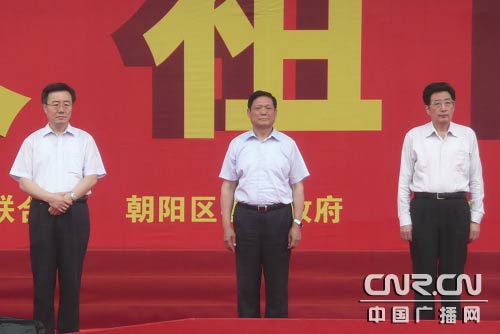 中广网北京6月6日消息(记者李文蕊 实习记者程淼)6日,“为伟大祖国骄傲”北京市庆祝新中国成立60周年系列文化活动启动仪式暨开幕演出在朝阳公园中心岛露天剧场举行。北京市领导及朝阳区主要负责同志出席了启动仪式。