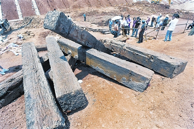 昨日一大早,工作人员用吊车将M2楚墓最外层的12块巨大椁板逐一吊离墓坑。每块椁板的宽度约为50厘米,厚度约为60厘米。有专家分析,这么大的椁板,一定是生长数百年的大树。当地属丘陵地带,今日基本无林地,两千多年前这里也未必能生长这样的大树,制造椁板的树木应是从别处运来。