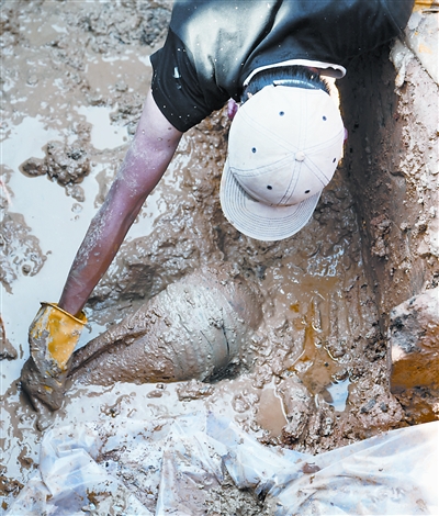 有两大因素影响清理工作进度,一是由于天气炎热,昨天发掘现场太阳暴晒下,气温直逼40℃,而墓坑内更是闷热;再则,清理工作是一项细活儿,每一团泥,考古人员都要一点一点地摸捏,以防漏掉任何有价值的发现。清了一天,边箱还未完全清完。