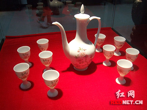 本次展览最大的亮点,莫过于展出的两套景德镇“7501毛泽东用瓷”(以下简称毛瓷),分别是一套酒具和一套茶具,而其中一套相同的“毛瓷”酒具,11年前长沙曾以120万元的价格拍出。因为目前此套酒具价值已升至300万元,此次展出的两套“毛瓷”,更加显得神秘而珍贵。湖南省文化艺术基金会秘书长杨汉林介绍说,1975年,景德镇集中当时最优秀的40多位陶瓷艺术家和技术人员,受命为毛泽东烧制一批专用瓷器,这批瓷器被称为“7501毛泽东用瓷”。除送京的瓷器外,部分瓷器被封存在工厂仓库里,改革开放后,共有2000多件封存的毛瓷流落民间。而此次展出的“毛瓷”包括一套酒具和一套茶具,图案是当年毛泽东亲自选定的“水点桃花”纹样,清新脱俗。
