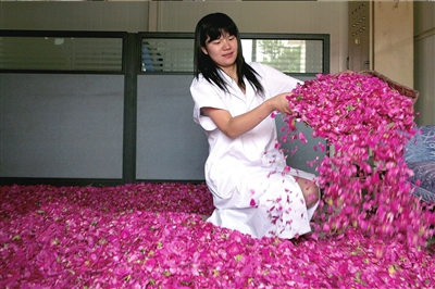 大图:生态工厂工作人员筛选提取玫瑰精油的玫瑰。左上小图:生态工厂工作人员展示提取玫瑰精油工序。近日,门头沟妙峰山峰顶一万多亩玫瑰竞相开放,吸引了众多市民前去观赏、采摘。与玫瑰谷相距不到10公里的山腰,一座以玫瑰花为原料,专门提取玫瑰精油的生态工厂也首次开放。据了解,这个小山沟生产的玫瑰精油贵比黄金,每斤价格均在10万元人民币以上。本报记者夏命群 通讯员何建勇摄影报道