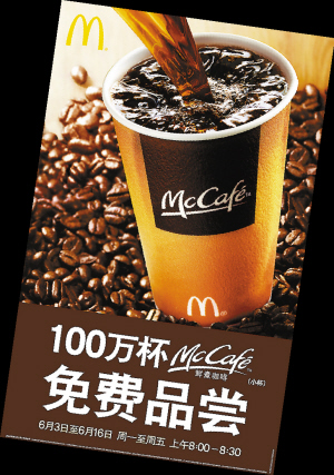 最引人心动的是,麦当劳发布100万杯免费赠饮的消息:从6月3日至16日(周一到周五)早上8∶00~8∶30,每一位光临麦当劳餐厅的顾客将免费获得一杯McCafe鲜煮咖啡。