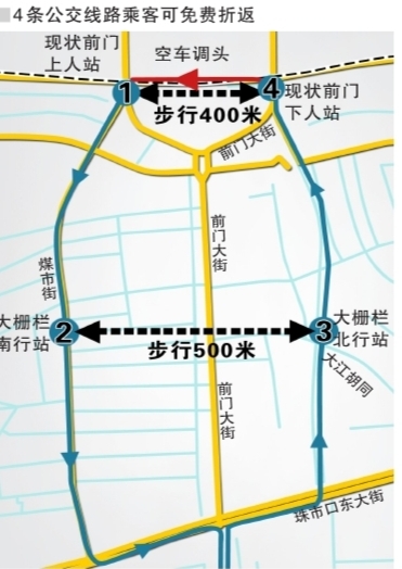 据悉,前门大街改造步行街后,原来在前门大街运营的公交线路分别调整到两侧的两条单行道路上,其中北向方向站台设在了前门东路上,南向方向站台则设在煤市街上,周边居民乘车时总有一个方向需东西穿行前门大街,步行较长距离,给乘客出行带来不便。