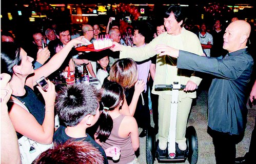 开幕当晚,成龙还充当“咖啡仔”骑着电动自行车,在8名保安护送下,捧着100杯咖啡招待现场来宾,场面热闹。