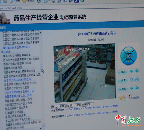 在南昌市食品药品监督管理局,工作人员打开视频监控网络向记者展示监控系统。据介绍,视频监控网络不仅可以对装有摄像头的药店进行实时监控,而且还可以随时随地将药店进货渠道、药品售价、药品有效期调出来查看,足不出户便可对药店情况“了如指掌”。一旦发现药店出售可疑商品,就可以立即通过监控系统的短信平台发出信号,委派专人处理。