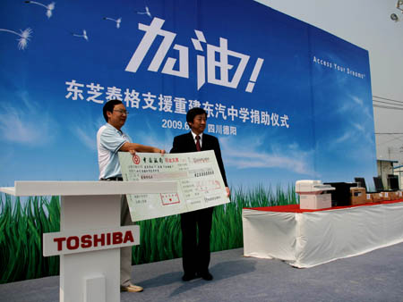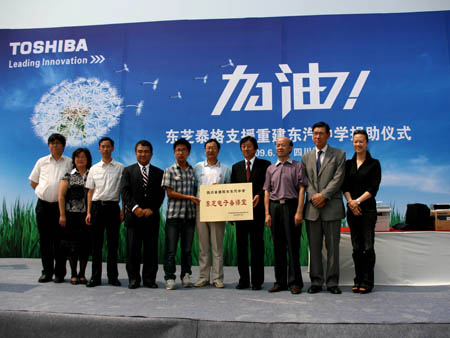 正是东汽中学师生们的英勇壮举,感动了世界,纷纷伸出援助之手帮助东汽中学浴火重生。5.12特大地震后,为了支援中国四川抗震救灾,东芝泰格一时间与其他东芝在华企业联合捐赠130万元人民币。东芝泰格一向认为,慈善应该是一项不间断的事业,所以,从2001年开始,就一直将希望爱心洒向四川、贵州、安徽、陕西、江西、广西、河北、吉林、西藏、云南、湖北等十余个省市自治区,帮助建立了多所希望小学,捐款近300多万。