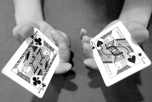道具:四张扑克牌,为两对,如图一对8,一对J。