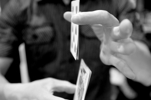 魔术效果:一开始是两个J面面相对,一甩手,怎么就变成了一对8面面相对了。