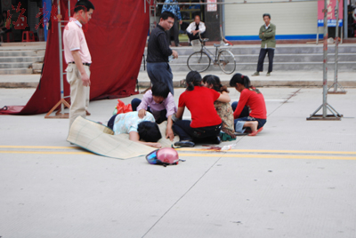 村民洪先生说,事发时,他听到公路上“嘭”的一声巨响,只见一辆摩托车和一辆牵引车撞在一起。摩托车上倒下一少年和一女子,少年头部流血一动不动,女子则挣扎着爬到男孩身边,掏出手机哭喊着,接着也倒在了地上。见状,牵引车司机马上掏出手机报警。