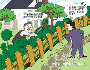 您如何看待别墅业主将公共绿地圈成私家花园?敬请登录本报网站www.cqwb.com.cn或致电本报热线966988发表看法。