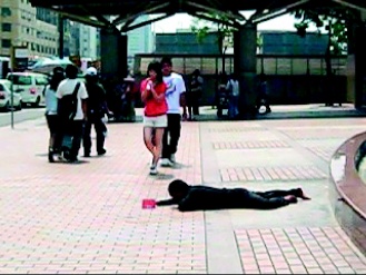 记者实地走访发现台北车站不只游民多,乞丐也超多,大门口一名拿着拐杖和免洗碗的男子,向进出旅客乞讨;站前广场一名衣裤破烂的男子趴在地上,他的头好像是装了电池,不停地瞌头;走没几步在人行道上,竟又出现另一名乞丐半身趴在地上,面前摆着一只碗向路人乞讨,短短一百米范围内,就“遇”上三名乞丐,却都不见有警察或是车站保全人员处理。