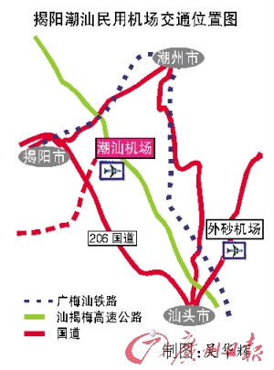 地处揭阳、潮州、汕头三市中心位置的揭阳潮汕机场今日正式开工建设。2011年,侨乡潮汕地区将摆脱目前军民合用机场的限制,真正拥有一座现代化的民用国际机场。揭阳潮汕机场启用后,将成为广东省内继广州白云和深圳宝安机场之后第三大干线机场。预计投入使用后2014年旅客吞吐量将达300万人次,货邮吞吐量20000吨。
