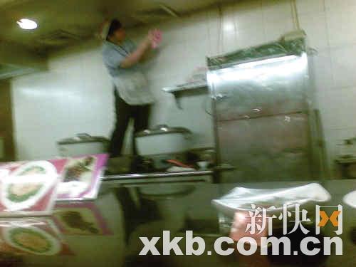 在洗碗间里,记者看见一盆漂着泡沫的水,于是问阿姨:“这是什么啊?”“水啊,洗碗的。”“怎么有泡沫呢?”“洗衣粉嘛,还加过漂水。”阿姨不耐烦地把洗好的汤勺塞给记者,然后把记者挤出了洗碗间。