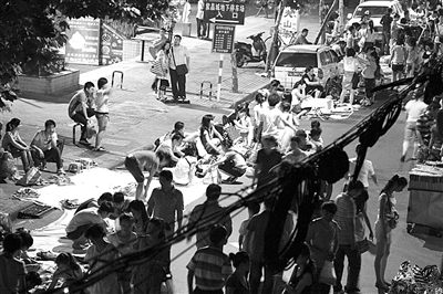 晚9时许,见城管人员下班走了,小方兴奋地站起来,整条街上的地摊正式开张,说笑声、讨价还价声此起彼伏……
