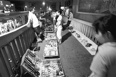 几天来,记者调查得知,武汉三镇均出现年轻人摆地摊的热潮,每天晚上9点后,武昌司门口天桥和汉阳钟家村天桥上,地摊一个挨着一个,卖手机链等小饰品,生意兴隆得很。可以说,哪里有商业闹市,哪里就有摆地摊的年轻人,就连很多大型超市的门口,也不例外。