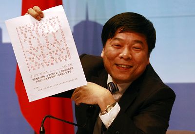 在昨天举行的新闻发布会上,市人力资源和社会保障局副局长毛大立向记者展示由17个部门联合印发的“居住证转户籍细则”文件封面。早报记者赵昀 图