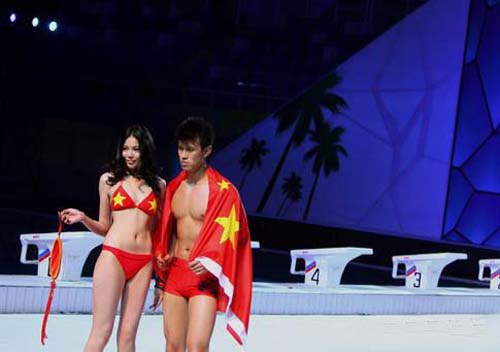 惊现水立方的比基尼时装秀图片,模特身披五星红旗走秀。将国旗图案印在比基尼上,实属不敬,恐怕应算对国旗的玷污。我认为主办方在活动前没有考虑到中国老百姓的接受程度,该受谴责。