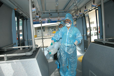 卫生部门对摆渡车辆进行消毒处理