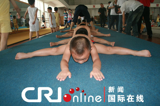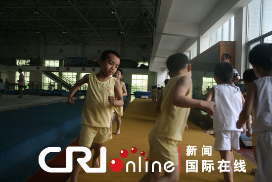 一大清早,学校里的孩子们就在体操房里刻苦训练,虽然天气炎热,并且体操房里没有空调制冷,但孩子们依旧在教练的安排下完成每一个动作、每一个步骤的练习,也许他们中在不久的将来又会诞生出更多的李小双、李大双、杨威、郑李辉…..