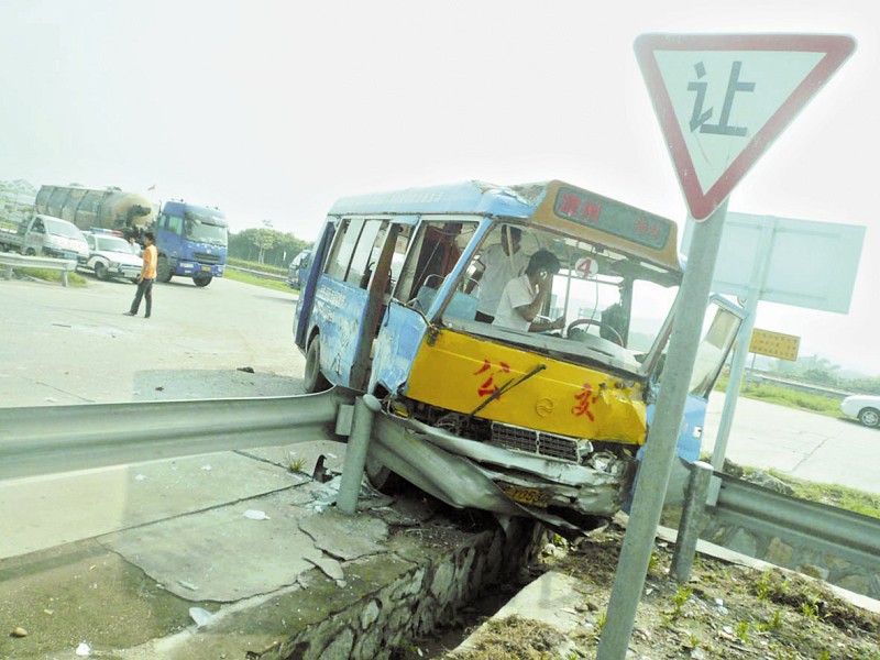 据货车司机描述,他开的是空车,从漳浦过来,在高速出口处与正在行驶的公交车相撞。公交车司机施师傅描述,当时他开车行驶在漳华路上,突然看见前面一部货车从高速出口出来,他赶紧刹车,但还是和货车撞上了。