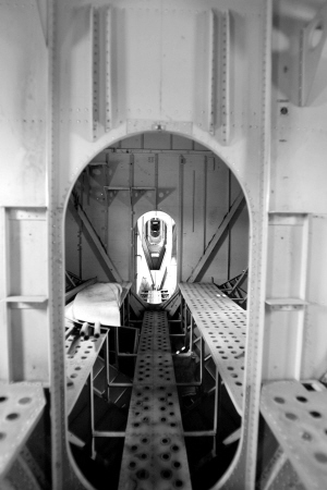 “里面只剩一个骨架,什么仪器都没有了。”站在这个庞然大物下,想进去看的念头油然而生。征得看守人同意后,记者在飞机旁找到一把已断裂的木制楼梯。在同事帮助下,勉强爬进机腹。密集的钢架支撑着整个空间,爬进飞机的第一感觉是里面像一段漆黑的隧道,椭圆形的多扇舱门,把飞机分为10个小房间。从中部舱门进入飞机到机尾,再返回舱门,记者已汗流浃背。在飞机中部,还有一道天窗。在空空如也的机舱内,除了少许积水外几乎看不到什么零部件。