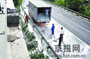 本报讯(记者轩燕龙)今晨7时30分,在北五环的箭亭桥南侧道路上,一辆满载面粉由西向东行驶的蓝色平板货车,右侧挡板被货物挤断,百余袋面粉瞬间碰断桥上的路灯杆后,砸到了下面的主路出口处,所幸事故中没有造成人员伤亡。