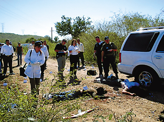 墨西哥库利亚坎市,闹市区俱乐部购物中心停车场到处都有弹孔,保安不愿回答问题,也不愿谈人行道上用西班牙语刻着的———“我们将永远爱你”这几个字。但是这座有100万人口的城市市民几乎人人都能够告诉你,2008年5月8日晚上9时这里发生了什么事:三名男子购物后钻进白色越野车,另外三辆车急速开到,然后就是一阵AK-47冲锋枪朝他们猛烈射击,还响起一声反坦克火箭筒的爆炸声;车内的三名男子全部身亡,除二名保镖外,第三人正是墨西哥头号通缉犯华金·古兹曼的22岁儿子。