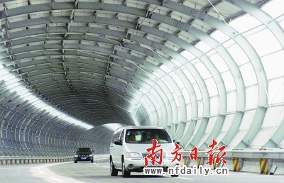 记者一行驱车从春岗立交由东往西行时,沿途见到最多的是竖在路旁的隔音板。而在距离永泰出口西边3公里的地方,记者则见到了造型精美的隔音隧道,绕行颐和山庄的东南侧;该隧道内部顶端和两侧分呈波浪形,顶部还镶嵌着玻璃。穿行其中,全然没有以往过隧道时的幽暗,而是明亮亮地一直延伸到出口处。