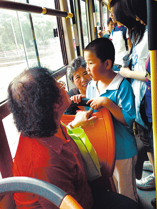说明:6月21日上午,在245公共汽车上。一个7岁的小男孩与奶奶一起乘车,祖孙俩都有座。当看到一位穿红衣服的老奶奶上车时,小孙子迅速地站起来让座。这个看似平常的动作,让全车的人肃然起敬,这孩儿真有家教,太懂事了!