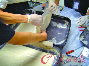 据悉,这批藏毒地毯是境外贩毒集团与新疆的贩毒团伙相勾结,先通过巴基斯坦航空托运将地毯运到马来西亚的吉隆坡然后再通过航空托运发往广州。毒贩是将毒品装进输液用的塑料管内,在织地毯时将密封好的塑料管子织进地毯的经线当中。