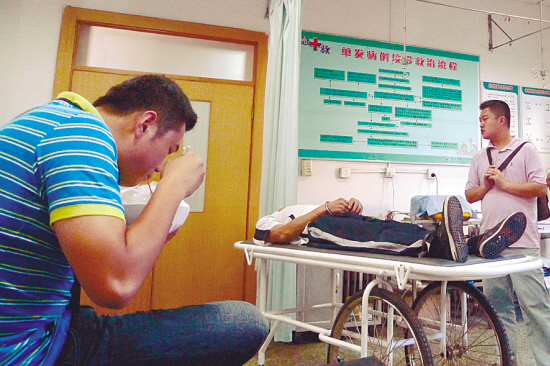 14时许,在市红十字会医院急诊室,记者看到犯罪嫌疑人戴着手铐脚镣静静地躺在急诊车上,三名身着便衣的警察守护在其旁边正吃午饭。一名便衣民警告诉记者,该名犯罪嫌疑人汪某,因涉嫌入室盗窃而被抓获。