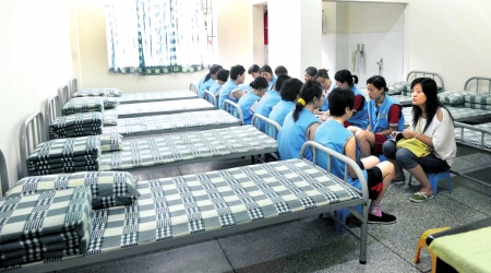通过了至少4道铁门后,前日下午,我终于在女警赵永兴的带领下见到了住在1—18病室的16个姑娘。“赵干好!”看到管教干部,姑娘们忙不迭地从座位上站起来,整齐地称呼着。我在一群穿着蓝色背心的“戒毒女”中坐了下来,目光所及之处,全是白净、红润的健康面孔,一瞬间,我竟有置身大学军训集体宿舍之感。