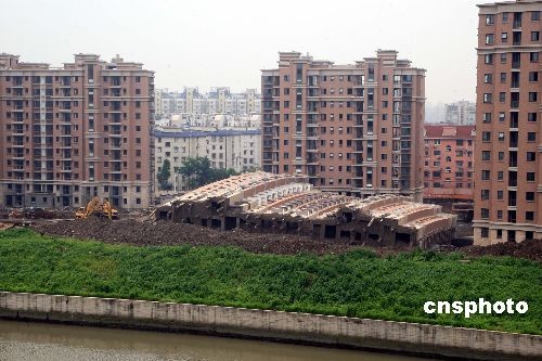 6月27日5点30分左右,上海闵行区莲花南路、罗阳路口西侧,一在建13层楼盘工地发生楼体倒覆事件,造成一名工人死亡。事故发生住宅楼盘名为“莲花河畔景苑”。中新社发潘索菲 摄
