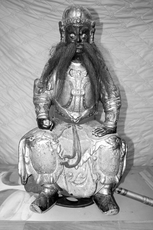 昨日,文保专家在同安新民镇柑岭村发现了一尊清代漆线雕护国尊王神像。该神像由整木雕成,坚实沉重,宽0.36米,高0.65米。神像曲膝端坐,面相漆黑奇异,白眼圆睁,髯须飘逸,双掌撑于膝上,右手持利剑,身着铠甲战袍,饰以金、红、绿、黑等不同颜色的漆线雕装饰,雕塑神奇,工艺精细,雕饰保存基本完好。“文革”期间,村内一位40多岁的女村民 (现已80多岁)将神像藏于包袱中,伪装成背小孩而偷偷将神像带出,藏到家中,才使得神像至今仍保存完好。