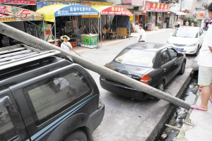 倒下的这根电线杆位于龙岗区布吉街道南门礅南上村军民路。据附近居民回忆,昨天下午2点左右,随着一声巨响,一根长约10多米的电线突然倒下,把人吓了一大跳。据悉,该电线杆先是砸中了停放在路边的一辆小轿车,随后又压到了后面的一辆越野车上,造成两车不同程度受损。事后,车主们都通知了保险公司前来处理,而倒下的电线杆把一大堆电线扯成一堆乱麻。