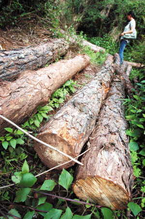 上周六下午4点,记者按照王先生所指的方向到达了牛鼻村水库后的山上。站在山脚下往上看,一棵棵枯黄的松树夹杂在青山之间,非常显眼。山脚还堆着很多砍伐下来的松树,已被锯成3米多长的木头,每棵的直径都在15厘米以上。按照树干上的年轮,很多松树都已经生长了15年以上,树龄长的甚至有20多年。