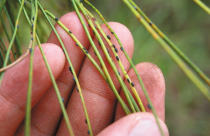 沿着山路往前走,过九龙山庄的牌坊后再往山顶爬,记者顺着一条运送松树下山的小道爬到了山顶,路边不时能看到枯死的云南松。在一些已经枯死的云南松周围,一些松树的树枝虽然还是绿色的,但梢头已经变红枯死。枯死的松树树干上,针头大小的虫眼清晰可见。在山上,记者还发现一些松树的松针上都长满了密密麻麻的黑色小虫,仅一根15厘米长的松针上就有七八条小虫。
