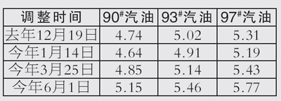 本报讯(记者张莉)自去年12月19日,国家按照新的成品油价格形成机制调整油价至今,半年多时间里,成品油价格已经调整了5次,其中前两次为降低价格,后三次为上调价格。除2008年12月19日那次新旧机制衔接的调价,此次(今年第4次)是新成品油价格机制形成以来调价幅度最大的一次。(前几次汽油价格调整情况见下表单位:元/升)
