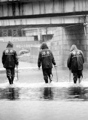 排水公司人员在金星立交桥下处理积水 记者杨海冬/摄