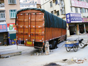 据目击者称,车轮被陷车辆是一辆江西牌大货车,当时该车行驶到福永街道桥头社区的桥和路上时,司机欲将车拐进旁边的一家百货批发商店卸货,就在车子拐弯的瞬间,可能是由于车子太重的缘故,大货车右后轮将路旁的排水沟的水泥盖板压碎,车轮也同时陷进里面,不能动弹。不多时,司机找来了6名年轻男子把车上的饮料一箱箱转移到另外一辆小型人货车上。