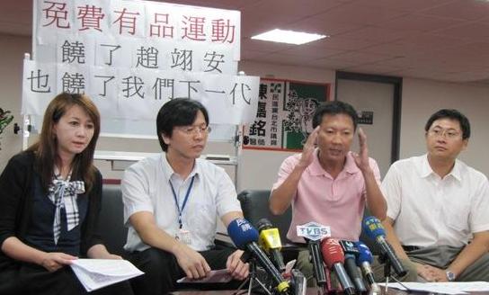 民进党市议员简余晏(左一)、李庆锋(右二)和陈建铭(右一)召开记者会,希望“教育部”推动的有品运动,就从赵翊安入学开始做起。