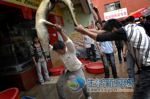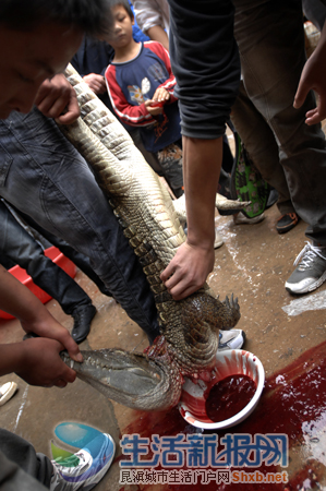 前日18时,和平村海鲜市场一家海鲜店门口挤满了围观群众。店里的小工将6、7条鳄鱼从木箱子里放出来,然后丢进大盆里。为防止鳄鱼咬人,鳄鱼的嘴被绳索紧紧拴住。鳄鱼挣扎着从大盆里逃出来,在地上扭动,围观者发出一阵惊呼。随后,一名男子将一条鳄鱼高高举起,狠狠地摔在地上,不一会,鳄鱼便一动不动了,店员们便开始对鳄鱼开膛破肚。 一名上门买鳄鱼肉的女顾客认为如此做法太过残忍,说了句:“肉弄好了再打电话给我!”便匆匆离开了。
