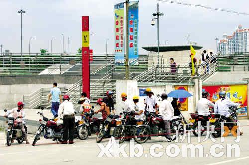 记者昨日在厦滘地铁站发现,出站口被数十辆摩的围得水泄不通,站外马路边还有几辆“黑的”大肆吆喝载客。除此之外,乘客没有其他交通方式:如果要搭乘公交或地铁接驳线,需顶着烈日走过约300米的荒地,到迎宾路换乘。