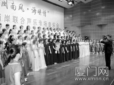 4日晚上,金门县合唱团联合厦门市青少年宫合唱团、妈妈合唱团,在市老年活动中心音乐厅举办“闽南风 海峡情”2009两岸声乐联合专场音乐会。两岸歌手表演了歌舞、混声合唱、女生小组唱、女高音独唱、童声合唱等形式多样的节目。