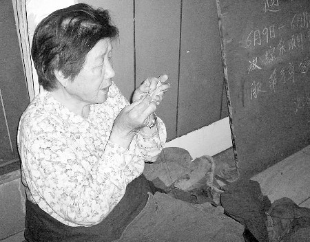 ▲侯秀荣为矿工缝补衣服,这是她在穿针引线。