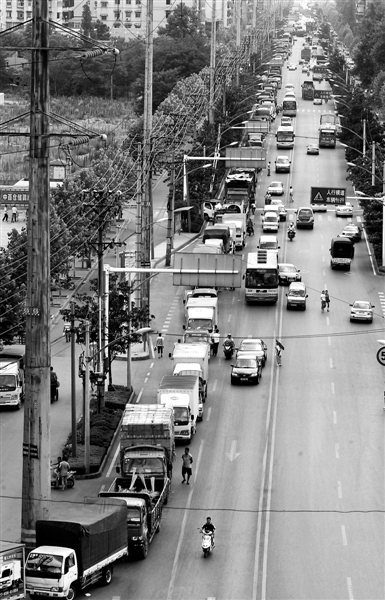 在鹦鹉大道建港路段,过武昌的大货车排起长龙等汽渡。记者肖僖 摄