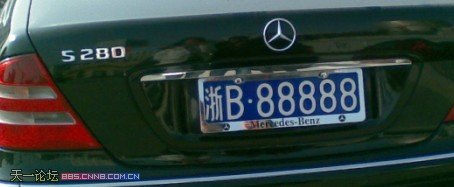 中国宁波网7月9日讯 昨天,网友“zym”快下班时在公司门口看到一辆车牌为“浙B.88888”的奔驰开进万豪。第一次看到这个号码,“zym”非常兴奋,可惜的是,她没来得及拍下车牌。不过,网友“蓝丫头”跟帖时提供了照片,说是在去年2月在天一广场拍的,看样子,这辆牛逼号的奔驰很高调啊。